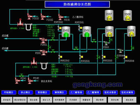 3、暫停和繼續調合功能,由于現場的意外情況,比如原料不足,系統提供了暫停功能,在次情況下系統自動的記錄當前的狀態,當外部條件滿足時,系統加載原來保存的數據繼續進行調合過程,減少操作工的勞動強度,并提高系統精度。 4、報表輸出 系統根據調合添加工程自動把采集到的數據填充到操作記錄和生產報表當中去,還提供了人工錄入界面,用來錄入一些沒有采集到的添加劑的數據。報表制作完成后可以保存到磁盤上或輸出到打印機。 5、用戶管理 整個系統納入安全管理的體系之下,只有系統認可的用戶可以進入系統沒有權限的人不可以訪問系統,在調和系統中分為幾個級別,操作員可以對系統進行控制設定添加量和啟動調合過程選擇配方等權限,工程師可以編輯修改調和配方,更改生產工藝的權限,管理員有添加刪除用戶并可以修改相應的操作權限的功能。 6、配方管理部分 防凍液針對不同的地區有不同的配方,而且在系統運行的過程中還要在線修添加修改配方,我們提供了在有權限認證的情況下配方編輯功能。 7、攪拌系統采用了先進的智能氣脈沖反應攪拌系統,噪音小,效率高。 8、系統提供了調節閥的關閉系數,夏季和冬季原料的黏稠度是不同的,造成原料在管道中的流速是不同的,由現場工人每隔一段時間根據現場環境情況自己掌握調節閥門的關閉時機。實測結果表明,此系數在設置合理的情況下,可以是系統的誤差在10噸原料下小于1公斤。