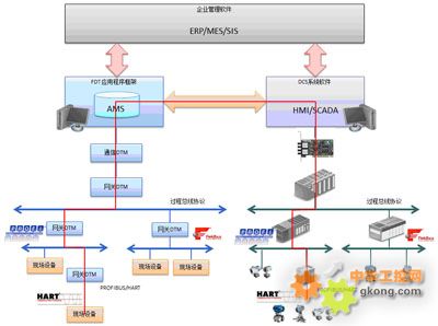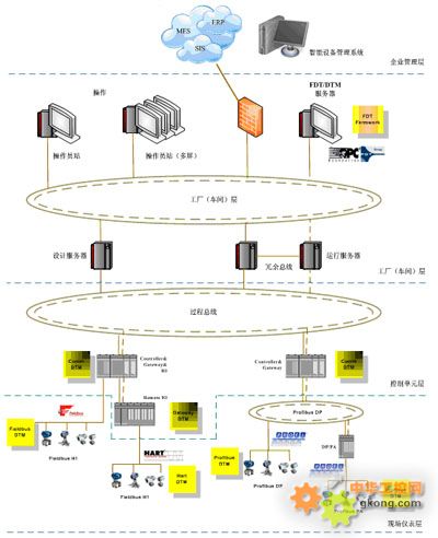 F D T 出現,很好的解決上述的這個問題,把多通信協議連接到一個簡單易用的用戶平臺,充分利用設備供應商在設備上傳遞的專業知識,降低最終用戶的成本和風險。結合現場總線( Fieldbus )新特性,將 FDT 技術應用于分散控制系統( DCS )中,一方面,降低 DCS 廠商開發 DCS 系統集成現場總線( Fieldbus )的難度,將多種現場總線友好的集成到 DCS 系統中;另一方面,充分利用設備供應商在設備上傳遞的專業知識,豐富和提升 DCS 系統功能,向信息化和集成化方向發展,實現真正的 DCS 。