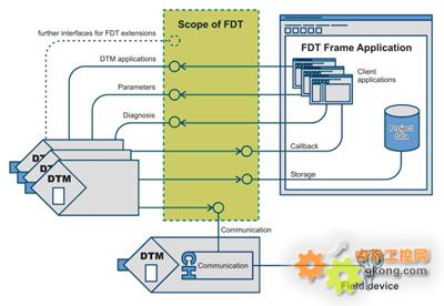 FDT ( Field Device Tool) 是一種開放、獨立、公開的軟件接口規范。該規范描述了工程框架和設備軟件組織之間的軟件接口和相互關系。 FDT 規范主要包括二個要素:設備類型管理器 (DTM) 、框架應用程序 (FA) 。它們是基于客戶端與服務器模型,其中 DTM 作為框架應用程序管理的服務器組件。