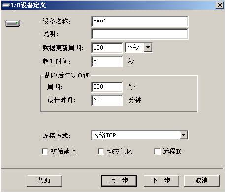 首先,在紫金橋開發系統的“數據庫”選項卡中,展開節點“設備驅動-〉PLC-〉Panasonic(松下)”,然后雙擊“DLU-MEWTOCOL/TCP(FP系列..)”,在彈出的“I/O設備定義”對話框中填寫基本的設備通訊參數,如下圖:
