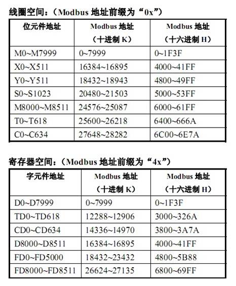 元件類型:支持的物理設備元件;可編程控制器內部軟元件編號與對應的 Modbus地址編號入下表示:
