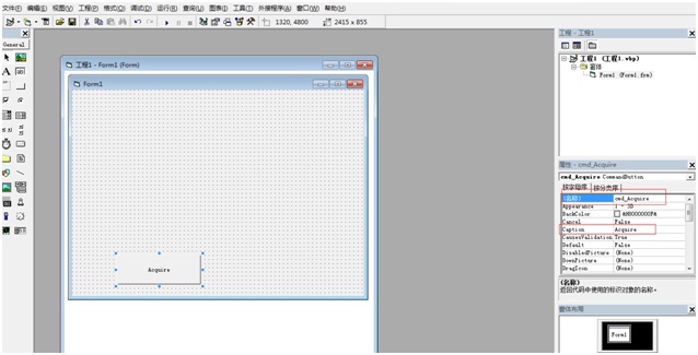 在界面上添加一個(gè)按鍵,名稱(chēng)為“cmd_Acquire”,Caption為“Acquire”,如圖5所示。