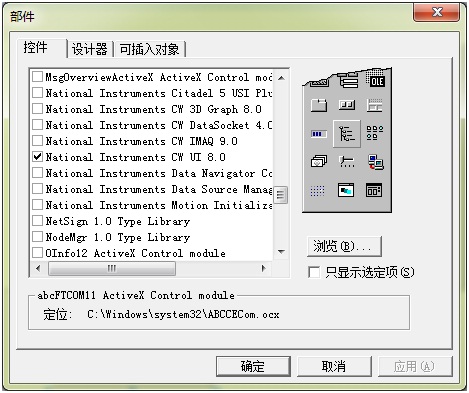 添加部件,為了可以使用支持NI板卡的界面模塊。如圖6所示,勾選“National Instuments CW UI 8.0”項(xiàng)。