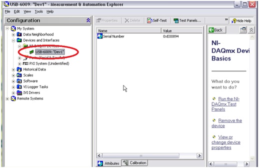 接下來(lái),在MAX中進(jìn)行板卡的參數(shù)配置,以NI USB-6009為例。插入U(xiǎn)SB-6009板卡,在MAX中識(shí)別出來(lái),在板卡左邊會(huì)有綠色標(biāo)識(shí),圖8所示。