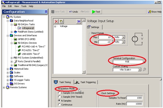 設(shè)置好采集Input Range(電壓范圍),Terminal Configuration(接線端配置)和Acquisition Mode(采集模式),如圖13所示。至此在MAX中創(chuàng)建采集任務(wù)完成。