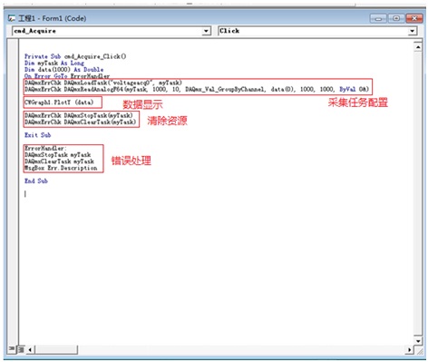 接著在VB的工程中進(jìn)行控件的事件響應(yīng)的函數(shù)編寫(xiě)。如圖14所示,DAQmxErrChk DAQmxLoadTask函數(shù)作用將MAX中創(chuàng)建的采集任務(wù)加載進(jìn)來(lái),DAQmxErrChk DAQmxReadAnalogF64函數(shù)作用是從通道中讀取數(shù)據(jù),PlotY函數(shù)繪制做采集數(shù)據(jù)至CWGraph1中。完成采集之后,需要通過(guò)調(diào)DAQmxStopTask和DAQmxClearTask函數(shù)清除資源。添加ErrorHandler代碼,這個(gè)代碼在任何DAQmx錯(cuò)誤發(fā)生時(shí)執(zhí)行。