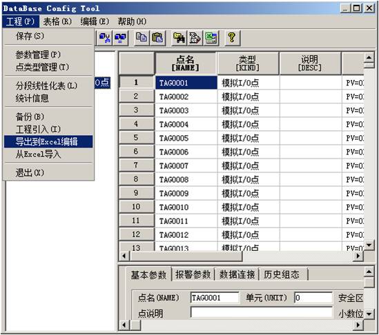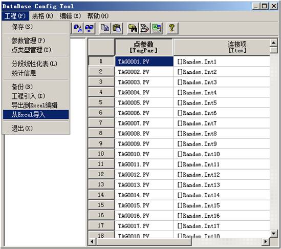 通過開發(fā)環(huán)境進入點組態(tài),在點組態(tài)窗口菜單上選擇“工程”,再選擇“從Excel導入”。如下所示: