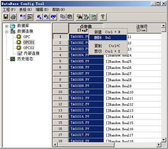 b. 清除分解設備上的數(shù)據(jù)連接項。在完成連接項備份后,在點組態(tài)的導航樹中找“數(shù)據(jù)連接”,再在它的下面找要分解出去的設備(可以保留一個設備在原有的驅(qū)動上),選擇這個設備;在右側(cè)列中會出現(xiàn)與這個設備相關的連接項,點擊“點參數(shù)”列表頭,選擇所有點參數(shù);單擊鼠標右鍵,在彈出菜單中選擇“刪除”,這樣即可清除與此設備相關的數(shù)據(jù)連接項。