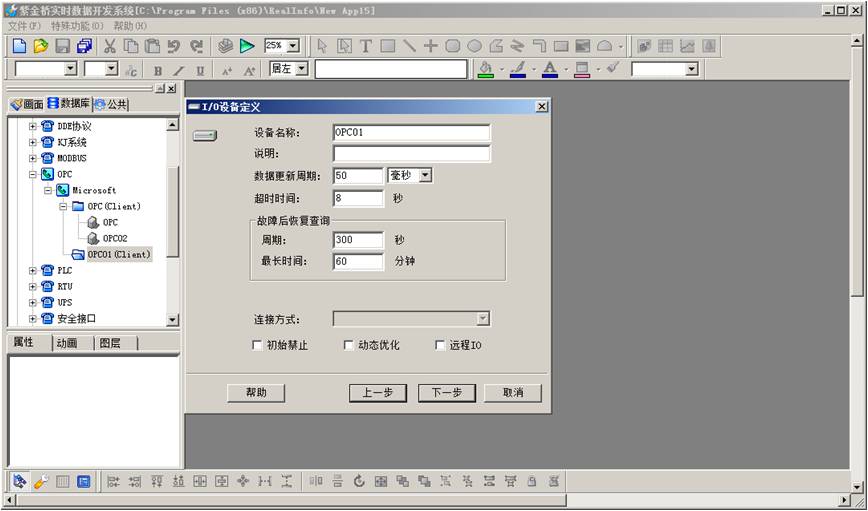 進入開發(fā)環(huán)境,從“數(shù)據(jù)庫”導航樹查找到OPC目錄下的Microsoft目錄,在這個目錄下找到OPC01(Client)驅(qū)動,雙擊它即彈出“I/O設備定義”對話框,用先前定義的設備名稱及參數(shù)定義這個設備。如果有其它設備操作方法與此相同,即通過同樣方法將設備轉(zhuǎn)移到一個分解出來的設備上。