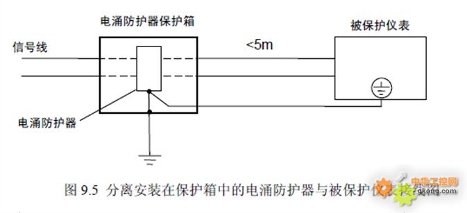 分離安裝的電涌防護(hù)器與被保護(hù)儀表之間的接線長(zhǎng)度不得超過5m,接地端子應(yīng)就近接地。圖9.5 為分離安裝在保護(hù)箱中的電涌防護(hù)器與被保護(hù)儀表接線示意圖。