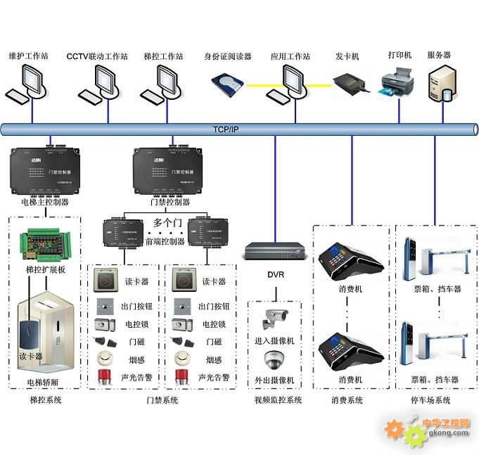 如服務器ui-sys用于數據存儲和處理,維護工作站用于系統維護,巡更工作站用于保安管理,電梯工作站用于電梯控制,訪客工作站用于訪客的管理,停車場工作站用于停車場管理,消費工作站用于收費管理。