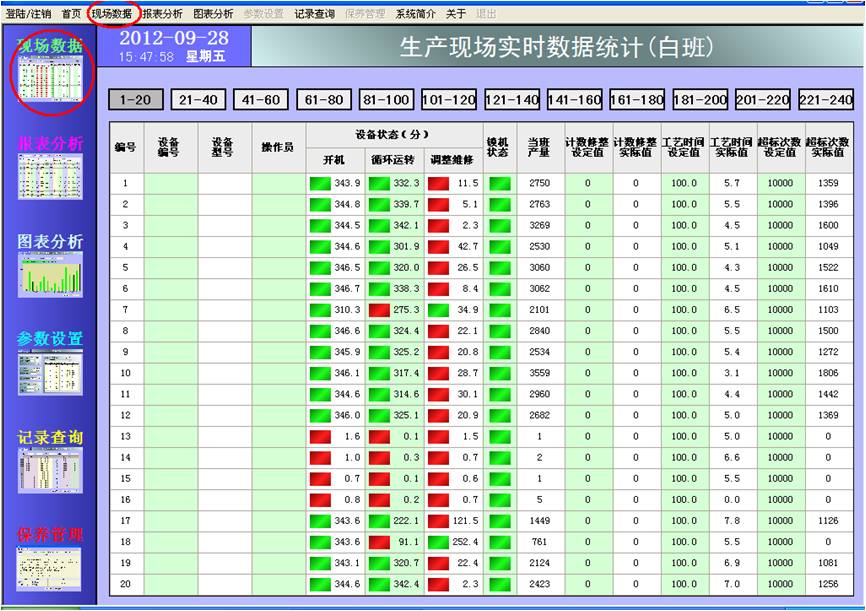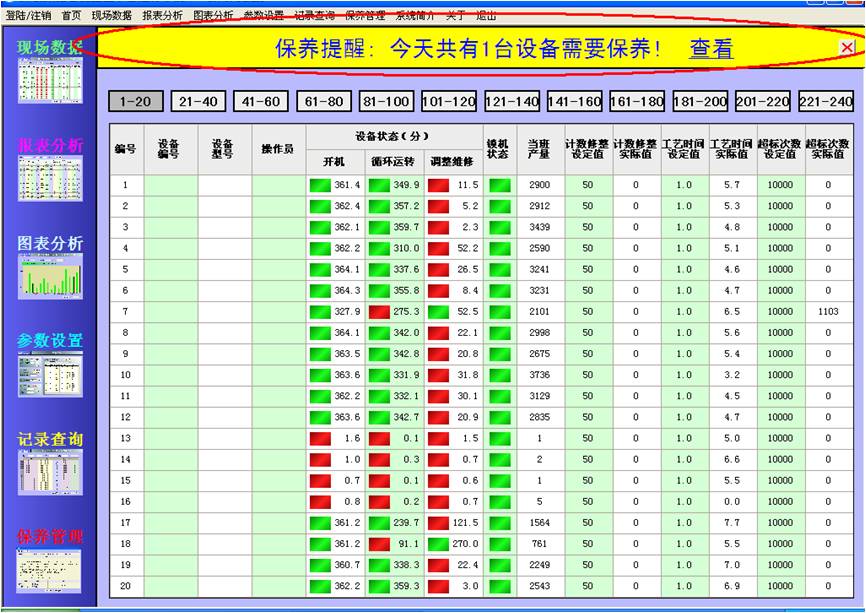 界面顯示每一臺(tái)設(shè)備的基本信息:編號(hào)(固定)、設(shè)備編號(hào)、設(shè)備型號(hào)、操作員;狀態(tài):開機(jī)、循環(huán)運(yùn)轉(zhuǎn)、調(diào)整維修、鎖機(jī)狀態(tài);數(shù)據(jù):開機(jī)時(shí)間、循環(huán)運(yùn)轉(zhuǎn)時(shí)間、調(diào)整維修時(shí)間、當(dāng)班產(chǎn)量、計(jì)數(shù)修整設(shè)定值(預(yù)留)、計(jì)數(shù)修整實(shí)際值、工藝時(shí)間設(shè)定值、工藝時(shí)間實(shí)際值、超標(biāo)次數(shù)設(shè)定值、超標(biāo)次數(shù)實(shí)際值。