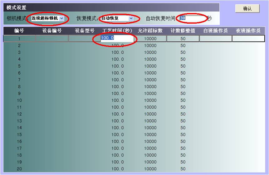 3 可以根據(jù)不同機(jī)床的產(chǎn)品生產(chǎn)情況,設(shè)定每臺(tái)設(shè)備的工藝時(shí)間,并根據(jù)管理策略設(shè)定不同的允許超標(biāo)次數(shù)、鎖機(jī)模式、恢復(fù)模式等,系統(tǒng)根據(jù)這些設(shè)定自動(dòng)進(jìn)行鎖、開機(jī),或交由人工執(zhí)行;