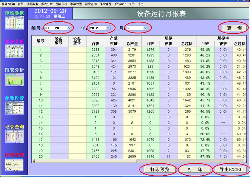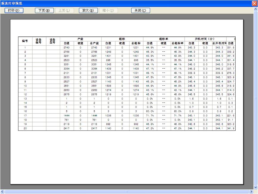 監(jiān)控系統(tǒng)可以為生產(chǎn)全過程的數(shù)據(jù)產(chǎn)生日?qǐng)?bào)表和月報(bào)表,按設(shè)備和班次統(tǒng)計(jì)產(chǎn)量、超標(biāo)、超標(biāo)率、開機(jī)時(shí)間、運(yùn)行時(shí)間、開機(jī)率和運(yùn)行率。