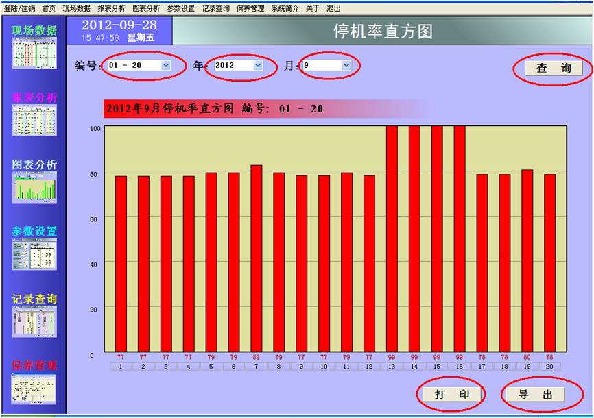 停機(jī)率直方圖通過選擇編號(hào)、年、月,然后點(diǎn)擊“查詢”按鈕進(jìn)行查詢,按編號(hào)統(tǒng)計(jì)的設(shè)備停機(jī)率直方圖即顯示在下方: