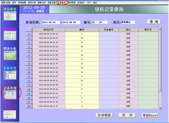 輸入查詢的日期范圍、編號(hào)、班次,然后點(diǎn)擊“查詢”按鈕,鎖機(jī)的相關(guān)記錄集即按照鎖機(jī)發(fā)生時(shí)間的倒序排列。