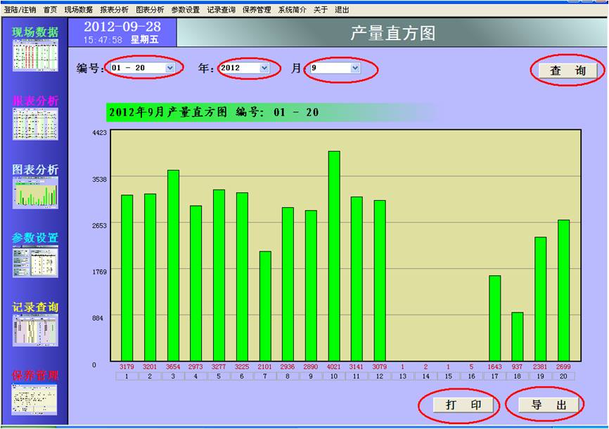 產(chǎn)量直方圖通過選擇編號(hào)、年、月,然后點(diǎn)擊“查詢”按鈕進(jìn)行查詢,按編號(hào)統(tǒng)計(jì)的設(shè)備產(chǎn)量直方圖即顯示在下方:
