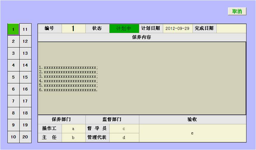 保養(yǎng)管理是用來查看和制定設(shè)備保養(yǎng)計(jì)劃的。制定保養(yǎng)計(jì)劃之后,當(dāng)保養(yǎng)日期到來,即提醒用戶。