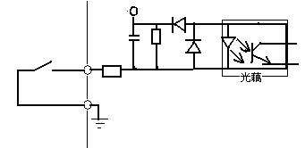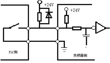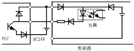 圖3 變頻器輸入信號的錯誤接法 當輸入開關信號進入變頻器時,有時會發生外部電源和變頻器控制電源(DC24V)之間的串擾。正確的連接是利用PLC電源,將外部晶體管的集電極經過二極管接到PLC。如圖4所示。 圖4 輸入信號的防干擾接法