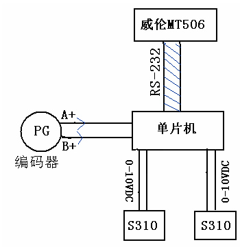 圖3 枕式包裝機送料和封切示意圖 ⑷ 加熱系統,對縱、橫封刀進行加熱是保證設備能夠正常工作的前提條件,一般需加熱到110~120℃,通常采用溫控表采集并控制封刀溫度。 2.功能實現 ⑴ 袋長設置 將要設定袋長直接由觸摸屏鍵入,單片機通過通訊讀取此值,再根據外部電位器給入的模擬量,以上兩個數值經過單片機運算,最終會輸出一個0~10VDC模擬量給切刀變頻器,控制切刀的動作頻率。單片機會根據包裝袋色標位置及切刀變頻器頻率計算出輸送帶變頻器的頻率(0~10VDC模擬量信號),控制輸送帶送料的速度。將送料速度和切刀頻率控制在一定的比例上,即可得到預期的包裝袋長。 ⑵ 色標位置修正 色標修正時包裝機的控制核心,為保證精度均采用正反雙向追蹤。設備運行后,薄膜標記傳感器不斷的檢測包裝袋上色標位置,同時根據要求設備運行快慢的信號,上述兩種信號送至單片機,經過運算后,單片機輸出控制變頻器頻率變化的信號,進行正追、反追,對包裝材料在生產過程中出現的誤差及時發現并予以準確的補償和糾正。 圖4 調試設備控制圖 ⑶ 其他功能 通過觸摸屏,在運行的時候,可以監控當前設備運轉速度、切刀誤差、對中誤差;記錄包裝產品數量,并可實現清零等功能。 ⑷ 變頻器參數設置 S310變頻器具體參數設置如下表,