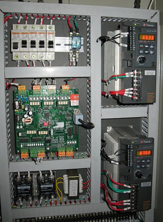 圖1 包裝機整體外觀 二.系統概述 1.系統組成 枕式包裝機主要完成定型、包裝、封口等功能,主要包括以下幾個控制部分: ⑴ 電控系統, 電源采用單相220V供電,電氣系統主要由單片機、雙變頻、HMI等組成。并在橫封刀上安裝一個接近開關,位置為切點;送料軸上裝一光電開關,在包裝材料的黑色光標通過時起作用;在送料電機的非負載端安裝一360線編碼器,對袋長進行計數,并將信號傳給單片機做處理控制變頻器運行。