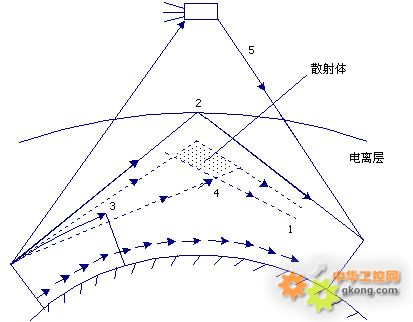 天波傳播,就是自發(fā)射天線發(fā)出的電磁波,在高空被電離層反射回來到達(dá)接收點(diǎn)的傳播方式。如下圖中2所示。電離層對(duì)電磁波除了具有反射作用以外,還有吸收能量與引起信號(hào)畸變等作用。其作用強(qiáng)弱與電磁波的頻率和電離層的變化有關(guān)。