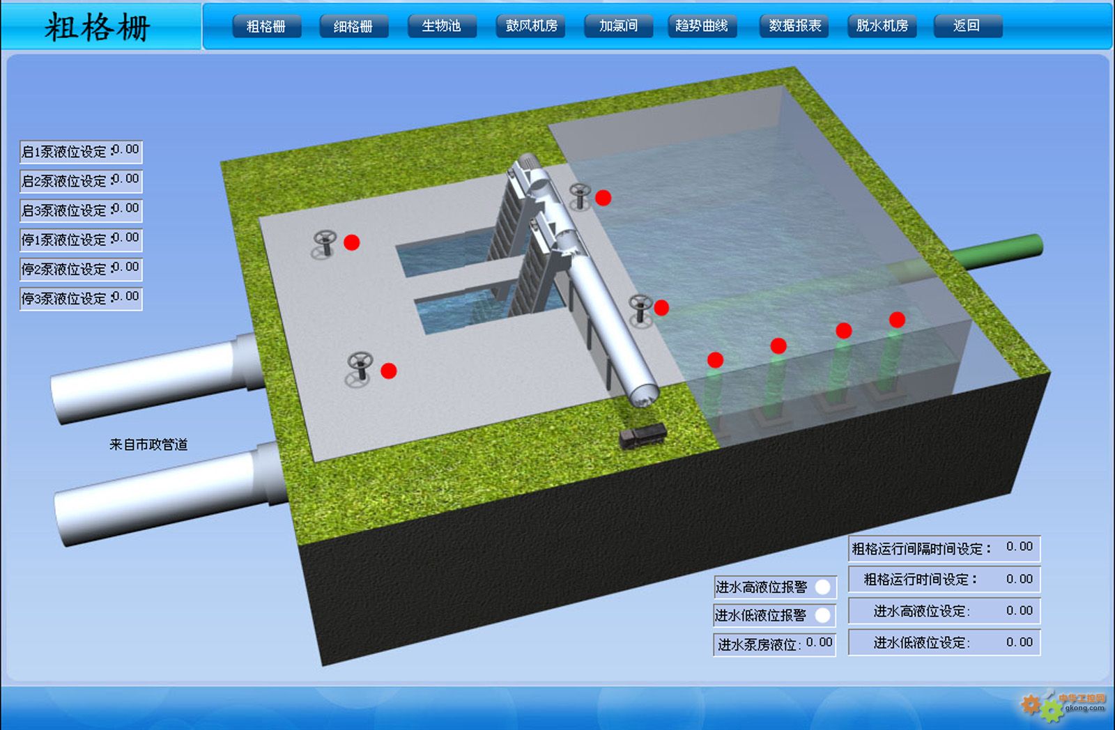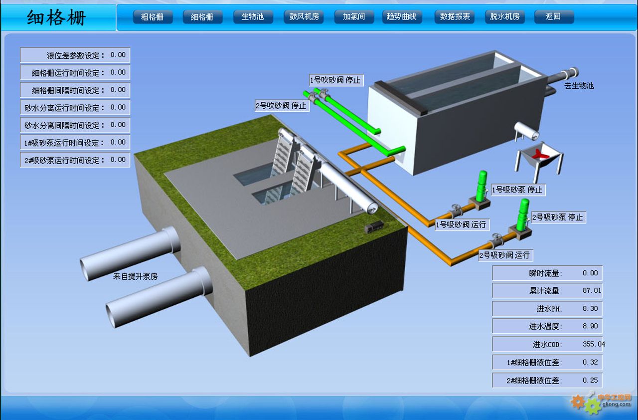 細格柵的間距比粗格柵小,為4mm,主要作用是進一步攔截污水中的污物。需要檢測格柵水位差、流量、泵狀態等參數。