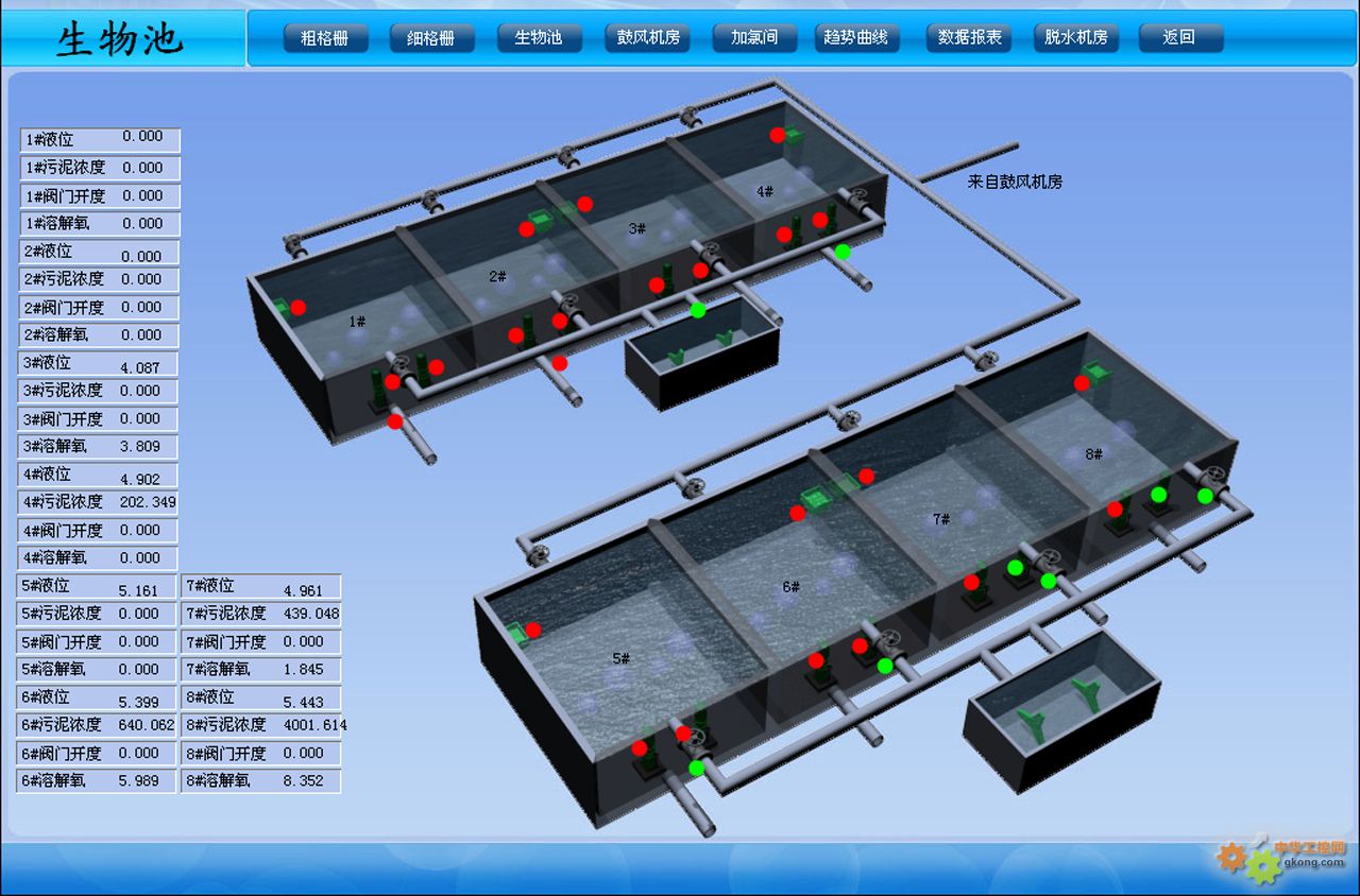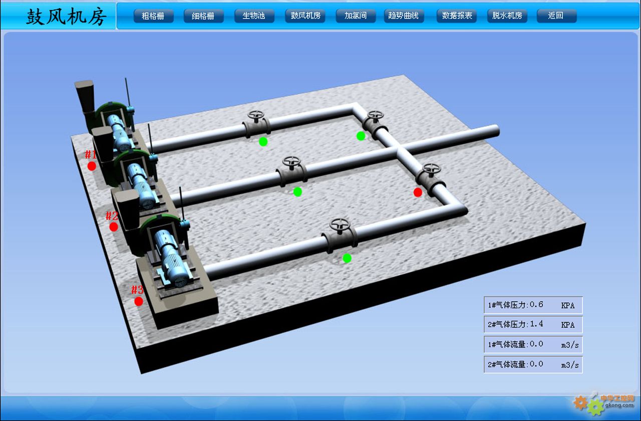 鼓風機房負責對反應池進行鼓風曝氣,該鼓風機房設置3臺鼓風機,兩用一備。需要檢測閥門、鼓風機狀態等參數。