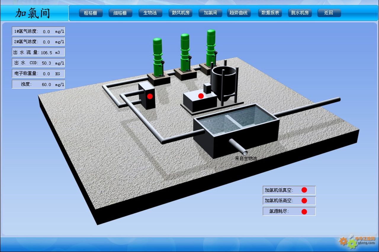 污水出廠前采用液氯消毒,經接觸池后出水由管道排向大海。需要監測加氯機狀態、氯氣濃度、氧氣濃度、出水流量、出水cod、電子秤重量、濁度等參數。