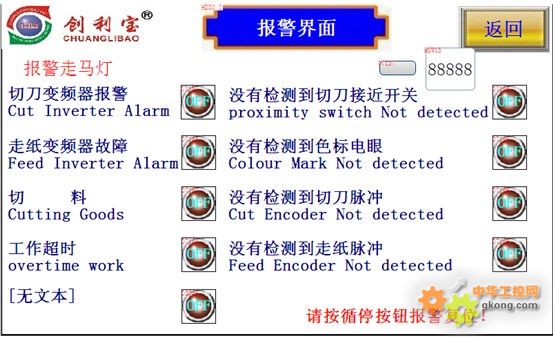 2.6“密碼以及報警”:設置了在畫面上進行修改密碼以及對一些參數設置的保密工作。同時可以具體查看機器是否出現故障。