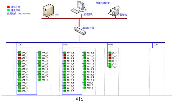 為滿足配電室統一監控的要求,配電室現場安裝安科瑞公司網絡電力儀表通過屏蔽雙絞線手拉手相連至串口服務器,串口服務器通過五類線接入后臺主機實現對現場數據的采集,存儲,處理,實時顯示以及歷史查詢,如下圖1: