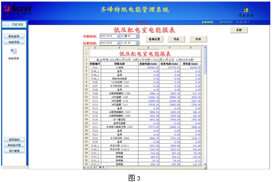 報表管理程序的主要功能是根據用戶的需要設計報表樣式,把系統中處理的數據經過篩選、組合和統計生成用戶需要的報表數據。本程序還可以根據用戶的需要對報表文件采用定時保存、打印或者召喚保存、打印模式。同時本程序還向用戶提供了對生成的報表文件管理功能。報表具有自由設置查詢時間實現日、月、年的電能統計,數據導出和報表打印等功能。