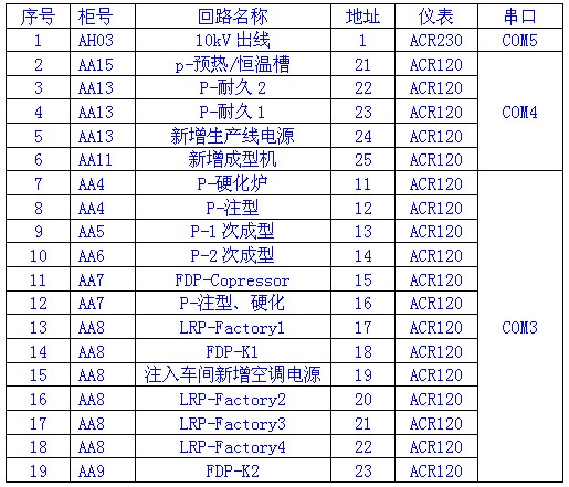 廠區配電中心為本項目提供一套高、低壓后臺監控系統,將對廠區內電氣室中改造安裝的19塊智能電測儀表進行集中監視。具體監控數據為:用電量計量、實時測量相電壓、線電壓、有功功率、無功功率、視在功率、功率因數、頻率等數據,能打印月度用電報表,并有歷史曲線的查詢(時間不小于30天),重要回路需要對其諧波進行測量。各參數及數據通過RS485總線,通過網絡送至配電中心的電工值班室(后臺監控中心)。