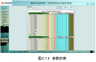 參數(shù)抄表功能,主要對低壓各出線回路的電參數(shù)進線查詢。支持任意時刻電參數(shù)查詢,具備數(shù)據(jù)導出和報表打印等功能。該報表查詢供變電所內6臺變壓器出線各低壓回路的電參數(shù),主要包括:三相電流、有功功率和有功電度及變壓器溫度。該報表各回路名稱和數(shù)據(jù)庫關聯(lián),方便用戶修改回路名稱。見圖(7)。