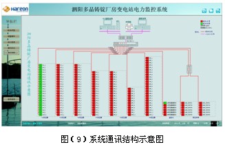 系統(tǒng)通訊結構示意圖,主要顯示系統(tǒng)的組網(wǎng)結構,系統(tǒng)采用分層分布式結構,同時監(jiān)測間隔層設備的通信狀態(tài)。紅色表示通訊正常,綠色表示通訊故障。見圖(9)。