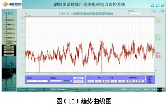 負荷趨勢曲線界面中可直觀的查看回路的負荷運行情況。查看實時和歷史趨勢曲線,點擊畫面相應按鈕或菜單項可以完成相應功能的切換;幫助用戶進線趨勢分析和故障追憶,具備曲線打印功能。為分析整個系統(tǒng)的運行狀況提供了直觀而方便的軟件支持。見圖(10)。