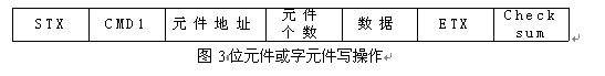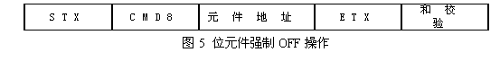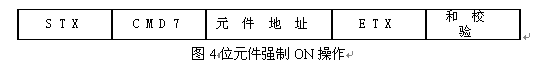 部分程序代碼: BOOL CPlcComDlg::ReadPLC(char *Read, char *address, int bytes) { CSerial Serial; char read_BUFFER; if(Serial.Open(m_com, m_Buad, m_Parity, m_Byte, m_StopBites)) { Serial.SendData(&ENQ_request,1);//發送聯絡訊號 Sleep(100); Serial.ReadData(&read_BUFFER,1);//讀取PLC響應訊號 if(read_BUFFER==ACK) { //初始化變量 //發送圖2命令格式代碼 ASCII(readdatasum_check,readdata_sum); //將STX-ETX之間的字符相加,轉換成ASCII(十六進制),并取和的低二位數。 if(*readdatasum_CHECK==*readdatasum_check)//和校驗 { //對讀出的數據進行處理,轉換成整型數 for(int j=0;j<bytes/2;j++) { for(i=j*2;i<j*2+4;i++) Read[i]=(Read[i]>0x39)?(Read[i]-0x41+0xA):(Read [i]-0x30); Read_value[j]=(((((Read [j*4+2]<<4)+Read [j*4+3]))+Read [j*4+0])<<4)+Read [j*4+1]; } return TRUE; } else return FALSE; } } } } //將整數轉換成ASCII(十六進制),并取低二位, void CPlcComDlg::ASCII(char *total_databytes, int read_bytes) { unsigned int uTmp; uTmp=read_bytes & 0x000f; total_databytes[1]=(uTmp<10)?(uTmp+0x30):(uTmp+0x41-0xA); uTmp=(read_bytes>>4) & 0x000f; total_databytes[0]=(uTmp<10)?(uTmp+0x30):(uTmp+0x41-0xA); } (3) 位元件或字元件狀態寫操作 操作對象元件:PLC內部的X、Y、M、S、T、C、D元件;命令格式如圖3所示。 程序代碼(略)。 (4) 位元件強制ON操作 操作對象元件:PLC內部的X、Y、M、S、T、C元件;命令格式如圖4所示。