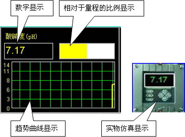 動態顯示監測數據 軟件以直觀的四種方式顯示監測參數的測量值: 數字顯示:最為原始,但最為有效的顯示方式。向用戶同步顯示當前分析儀的測量值。 量程比例顯示:以進度條的形式向用戶表示當前測量值相對于整個量程的比例。 趨勢曲線顯示:每分鐘更新一次曲線位置,可以讓用戶不必查閱歷史數據的情況下快速的了解最近時段內監測參數的狀況。 實物仿真顯示:針對相應分析儀在流程圖中所處的位置進行測量值的顯示,令用戶更加直觀的查看數據。