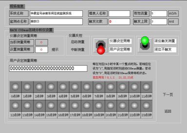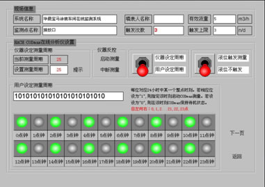 對于連續排放的情況,可以采用“用戶設定周期”+“液位不觸發”的工作方式。需要強調的是,采用“用戶設定周期”后,必須在兩個選項中設定相關參數:1、在“用戶設定測量周期”欄中設定啟動儀器測量的時間。2、在“儀器設定測量周期”欄中將儀器設定為“25”即:“觸發”方式。 “用戶設定測量周期”欄中設定的時間是以整點小時來做為測量時間的,這樣可以解決CODmax無法自動實現整點測量的問題。與相應整點時間對應的綠燈亮表示CODmax將在這一時間啟動一次測量。