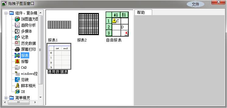 創建通用數據表:打開“拖拽子圖到窗口/組件、復雜精靈/報表/通用數據表”。如下圖: