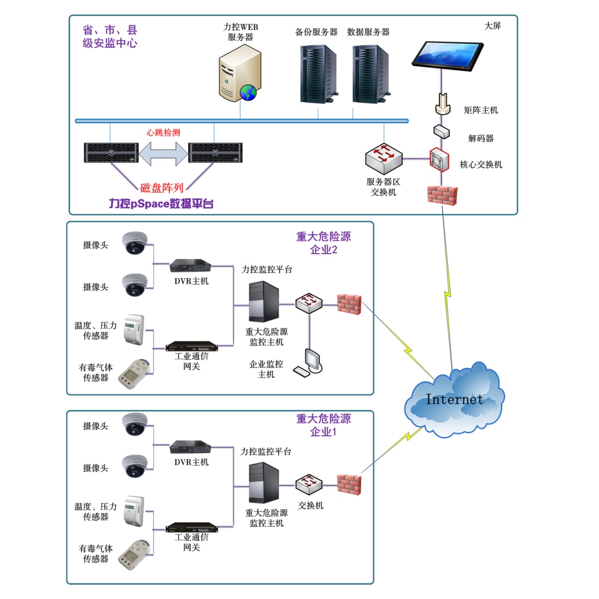 一、概述 隨著社會經濟和文化生活的不斷發展,公眾服務和公共安全就成為政府部門和各行業部門的一個非常重要的工作。提高政府及各行業部門對緊急、突發事件的快速反應和抗風險的能力,建設救援指揮系統為公眾提供更快捷的緊急救助服務,已成為社會一個迫切的課題。對重大突發事件的現場高效指揮調度處理能力已經成為現代化管理程度的重要標志之一。 隨著城市建設的發展,一些有毒、有害、易燃、易爆等危險源有明顯向城市整體區域擴散的趨勢,由此產生的火災、爆炸和毒物泄漏等重大災害事故也屢屢發生,嚴重危及了城市安全。為了城市的安全,必須把城市重大危險源的控制與管理提到重要位置。 危險源對象是指工業生產過程中所需的以及各種生產場所擁有的設施或設備,如罐區、庫區、生產場所等對象。這些對象有各種易燃、易爆、毒性等危險物質,對安全生產和人身安全構成了極大的威脅。它們的特性參數是重大危險源監控預警系統所要關注的主要參數,將這些參數進行數據采集,轉換成計算機所能識別的信號,進行計算機對重大危險源的檢測、監視、預警和控制,預防重大事故的發生,實現安全生產的目的。 二、系統架構設計 在可燃氣體、危險化學品、固體廢棄物、危險設備等行業,實時監測重大危險源和其他高風險場所、裝置的運行和管理狀況,提高安全監管部門和相關單位的安全生產日常監管、風險管理、預測預警和應急處置能力,有效降低安全生產事故率,并為市領導掌控本市安全生產總體情況提供服務。 從政府角度分析: ◆ 通過本系統能夠為各級安監部門全面、準確、快捷掌握生產企業的實時生產狀況。 ◆ 通過本系統能夠幫助各級安監部門全面掌握所監管的各個生產企業的安全生產情況,如各企業的基本情況、各企業重大危險源的情況、應急預案、生產過程中的規范要求及安全人員的監督狀況等,實現企業的安全監管。 ◆ 通過此系統能夠幫助各級安監部門監管各類重大危險源詳細的生產狀況及位置分布。 從企業角度分析: ◆ 可對各類涉及安全生產重要崗位的人員和操作過程進行監控錄像。 ◆ 對各類涉及安全生產車間、倉庫等場所的重要數據(如有毒氣體濃度、溫度、壓力)進行監測,超限時進行報警。 ◆ 可對安全生產內部管理文件、信息進行網絡發放、申報。 ◆ 可對危險化學品儲罐區、倉庫等進行監控錄像。 ◆ 通過網絡,如計算機、手機,企業管理人員不管身在何處,可以實現對本企業重點部門的實時現場監控,并可發出相關指令。 系統總體框架如下:
