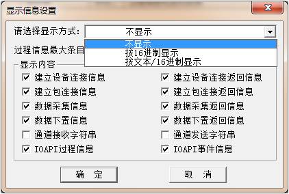 顯示方式設(shè)置為16進制顯示或按文本/16進制顯示,具體選擇哪一個,視驅(qū)動通訊協(xié)議而定,如果設(shè)備驅(qū)動協(xié)議是ASCII碼,建議選擇按文本/16進制顯示;如果設(shè)備通訊協(xié)議是二進制方式,建議選擇16進制顯示。