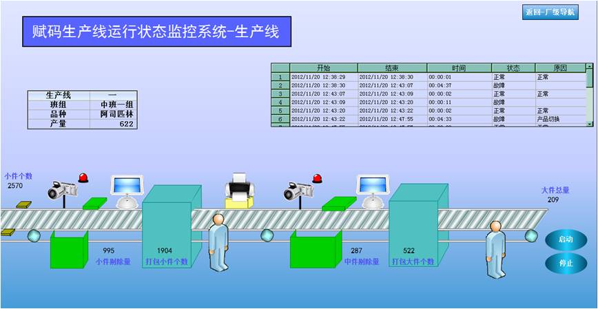 實時狀態畫面:顯示單條生產線的實時運行狀態,包括各個打包階段的產出數量,剔除數量,設備狀態等;另外實時顯示當前生產的班次、品種和最終產量。