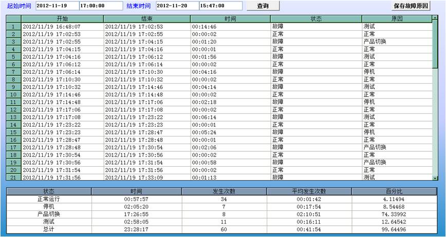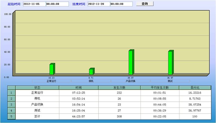 生產狀態報表:能夠查詢某一時間范圍內的各種狀態發生的起始時間,并按狀態類型給出全局對比,給出某一狀態在該時間段內發送的總時間、發送的次數、平均發生時間和時間的百分比對比。