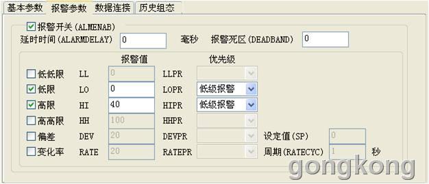 其中工藝條件按照實際需求設置。保存后運行紫金橋軟件,就可以發現,當工藝條件出現時,報警功能工作,Temp1點的PV值出現異常時,系統開始報警;當工藝條件不出現時,報警功能關閉,即使Temp1點的PV值異常,系統也不會有報警出現。