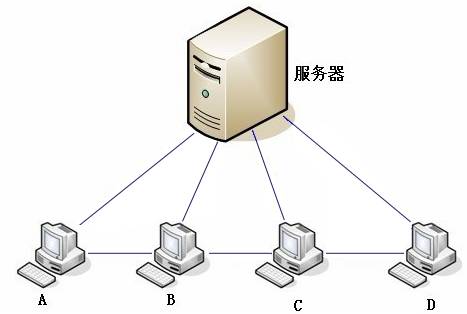 首先給大家簡單的介紹一下腈綸廠項目某車間的操作流程,它的現場是有5臺電腦,A,B,C,D和服務器Server。其中B,C,D是生產數據,然后通過SQL Server的存儲過程功能把數據上傳到服務器,A機的主要作用就是按照條件查詢B,C,D每天生產的數據然后生成報表。下面是此車間的網絡示意圖: