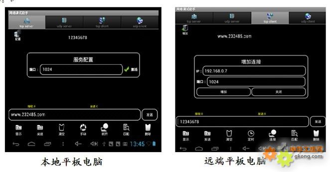 現(xiàn)在2臺(tái)Android平板電腦就可以通過光纖進(jìn)行通信了。成功連接后,可以在發(fā)送區(qū)輸入你要發(fā)送的數(shù)據(jù)或字符。如果這時(shí)遠(yuǎn)端平板電腦發(fā)送數(shù)據(jù)比如“12345678”,那么這些數(shù)據(jù)將透明傳輸?shù)奖镜仄桨咫娔X的網(wǎng)絡(luò)助手的界面中,并在接收區(qū)顯示“12345678”。反向通信也一樣。