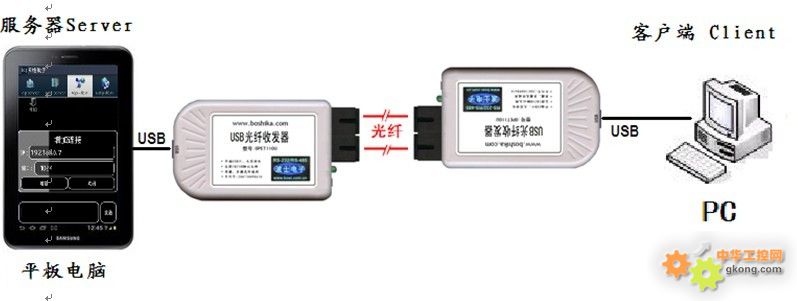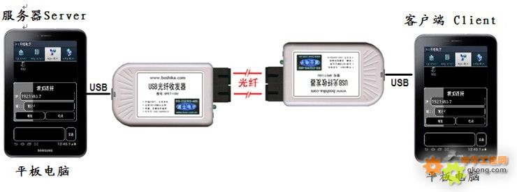 Android平板電腦通過USB口接波仕電子OPET110U的USB光纖收發(fā)器轉(zhuǎn)換出光纖,另外一端的計(jì)算機(jī)也是是在USB口外接同型號(hào)的USB光纖收發(fā)器。通過光纖將雙方連接起來。