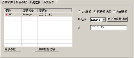 數(shù)據(jù)源就是要連接的遠(yuǎn)程的數(shù)據(jù)服務(wù)器,點(diǎn)是遠(yuǎn)程數(shù)據(jù)庫(kù)的點(diǎn)參數(shù)。這樣連接完成之后,當(dāng)前選中的點(diǎn)參數(shù)(如LIC110.PV)就與遠(yuǎn)程數(shù)據(jù)庫(kù)的指定點(diǎn)參數(shù)相對(duì)應(yīng)了。這時(shí)在本地?cái)?shù)據(jù)庫(kù)中就可以使用該點(diǎn)參數(shù)(LIC110.PV)進(jìn)行控制、運(yùn)算,它等同于遠(yuǎn)程數(shù)據(jù)庫(kù)的LIC101.PV。