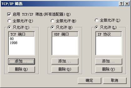 選擇“選項(xiàng)”頁(yè),選擇“TCP/IP 篩選”項(xiàng),點(diǎn)擊“屬性”按鈕,彈出端口過(guò)濾對(duì)話框,如下圖所示: